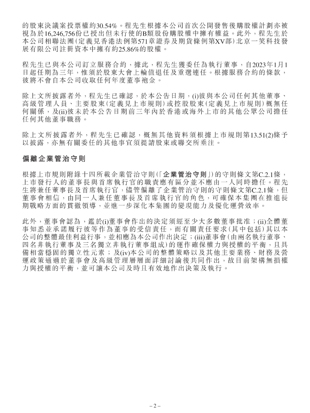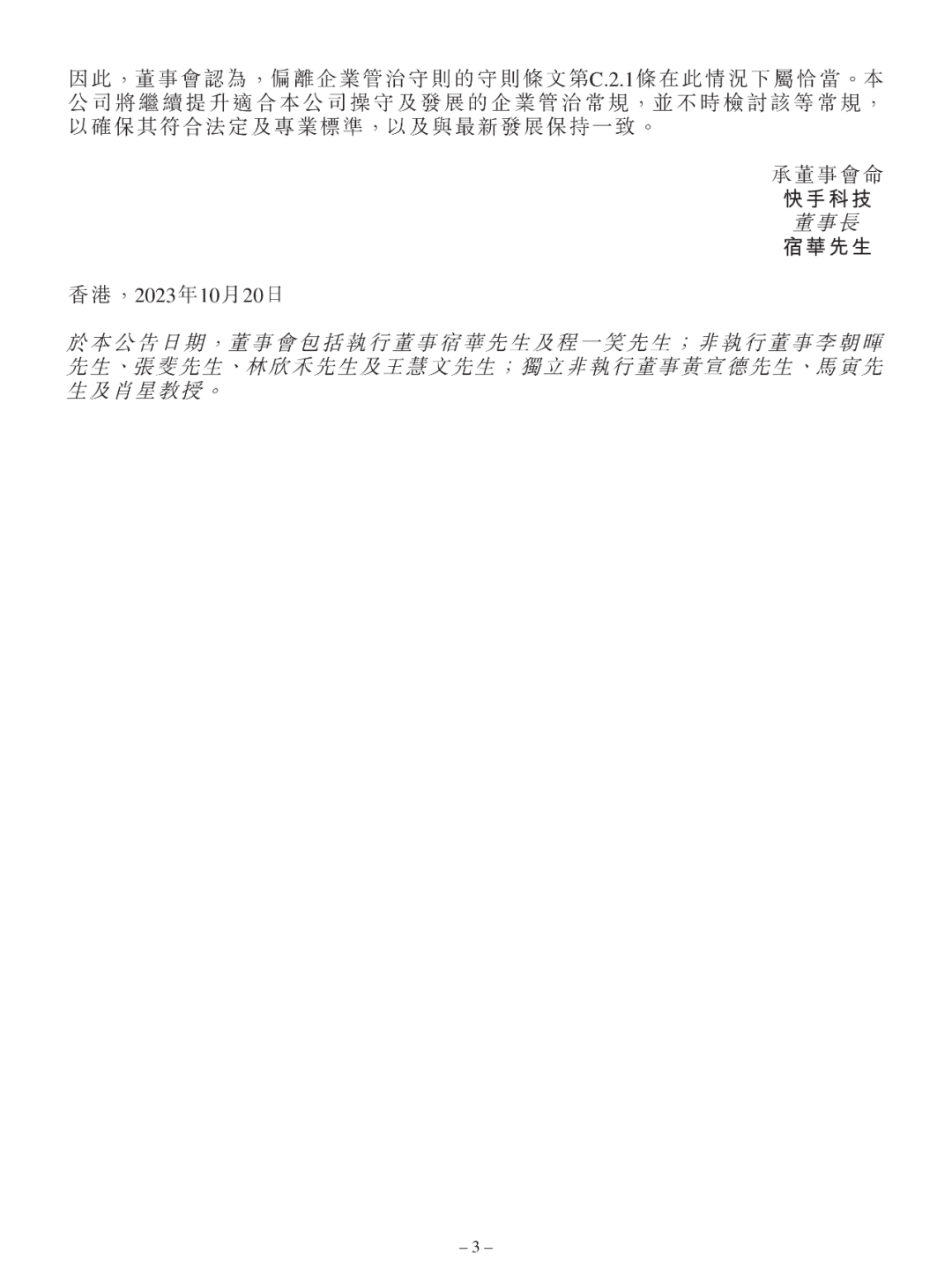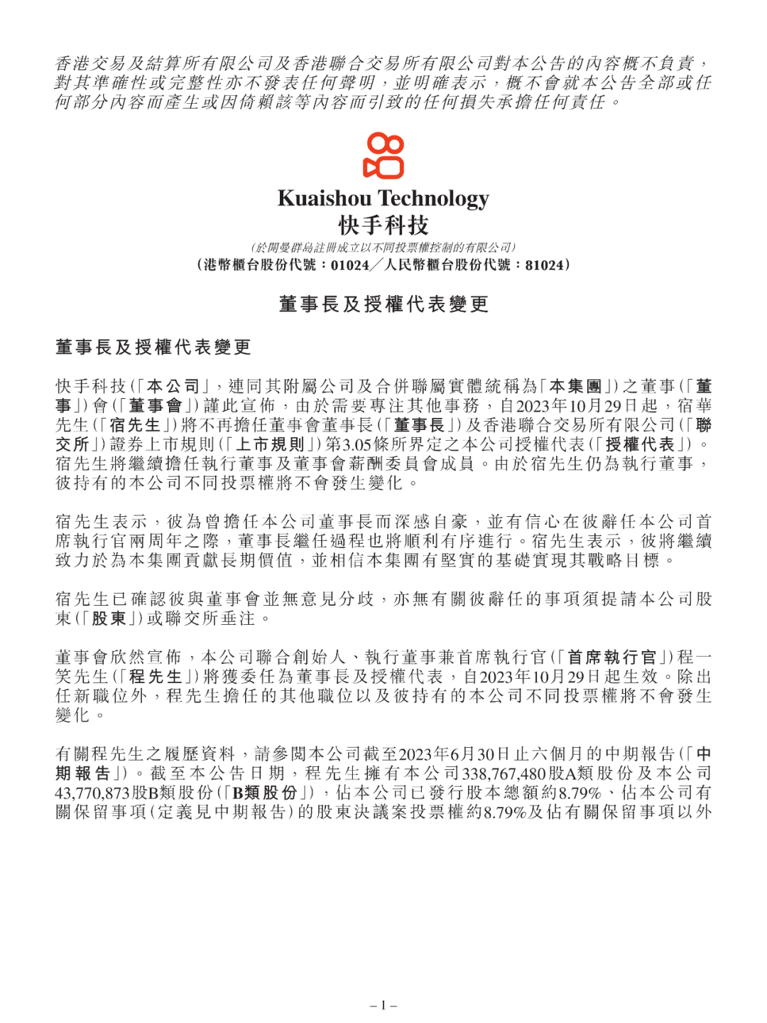 公告显示,由于需要专注其他事务,自2023年10月29日起,宿华不再担任董事会董事长,将继续担任执行董事和薪酬委员会成员,其不同投票权不会发生变化。