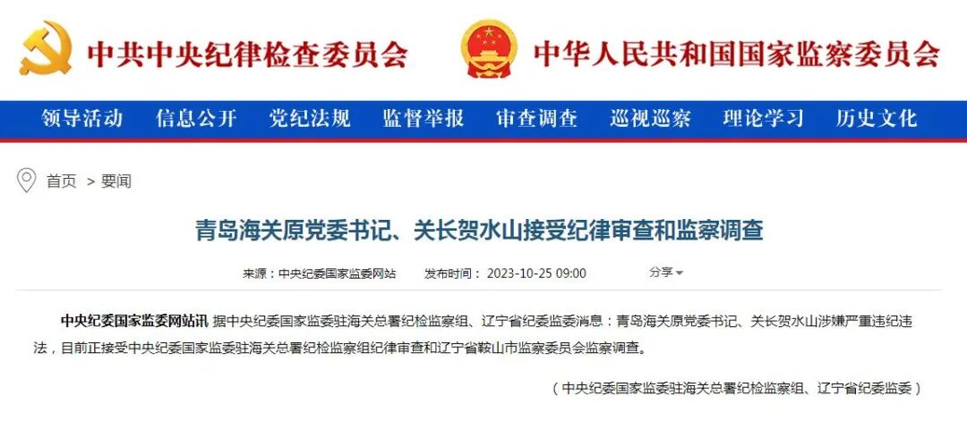 据中央纪委国家监委驻海关总署纪检监察组、辽宁省纪委监委消息:青岛海关原党委书记、关长贺水山涉嫌严重违纪违法,目前正接受中央纪委国家监委驻海关总署纪检监察组纪律审查和辽宁省鞍山市监察委员会监察调查。