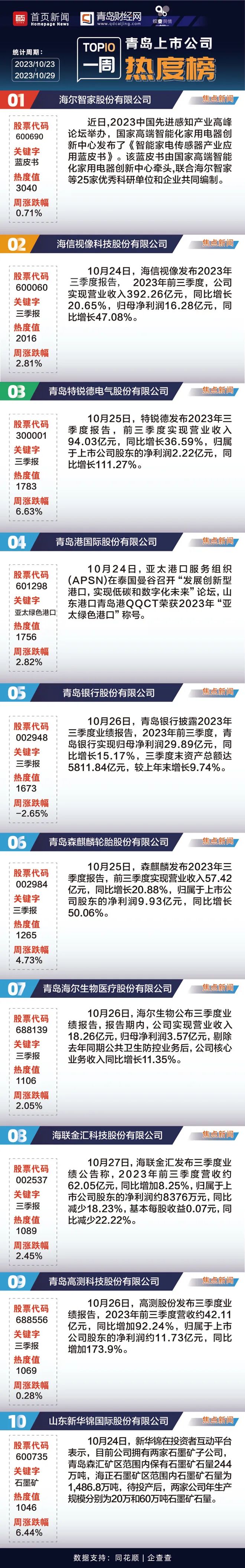 本周,海尔智家、海信视像、特锐德分别列热度榜前三位。青岛67家境内上市公司,近九成实现股价上涨,涨幅领跑的是国林科技、三柏硕、ST鹏博士。本周,青岛46家境内上市公司陆续发布2023年前三季度业绩报告,其中,23家公司均实现营业收入及归母净利润同比双增长。