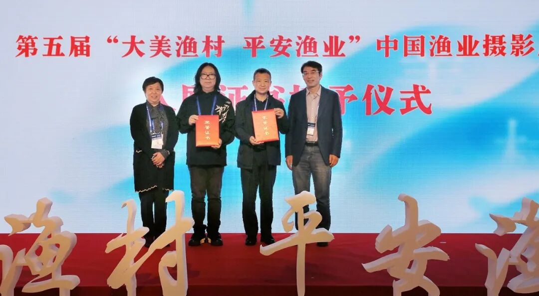 中国水产科学研究院副院长崔国辉、中国摄影家协会副主席宋靖向入展作者代表中国摄影金像奖获得者罗韬、颜劲松颁发“大美渔村 平安渔业”中国渔业摄影展荣誉证书。