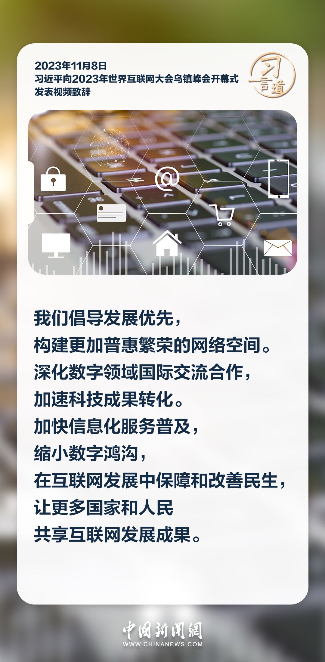 【乌镇“网事”】习言道|共同推动构建网络空间命运共同体迈向新阶段 2023-11-08 15:02 0 11月8日上午,国家主席习近平向2023年世界互联网大会乌镇峰会开幕式发表视频致辞。习近平指出—— 来源:中国新闻网 责任编辑:王海山