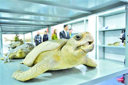 原生动物、海洋植物、海洋动物……走进青岛39中海洋生物科教馆其中一个展厅,就像是观看了一部海洋生物演化的大片。原生动物类别里展示着有孔虫的模型,节肢动物门类别里则展示着螃蟹、龙虾等生物标本。每种类别的标本看起来都是栩栩如生,如不仔细辨别,很难分辨其真假。“这个展厅里主要是对海洋生物的一个分类,每个种类都有一些代表性的模型或者是标本,基本上是从简单到复杂这样一个顺序排列。”青岛39中海洋教育博士工作站站长白晓歌告诉记者。走进科教馆另一个展厅,里面则展示着绿海龟、须鲸、中华鲟、瓶鼻海豚等大型海洋生物的标本。
