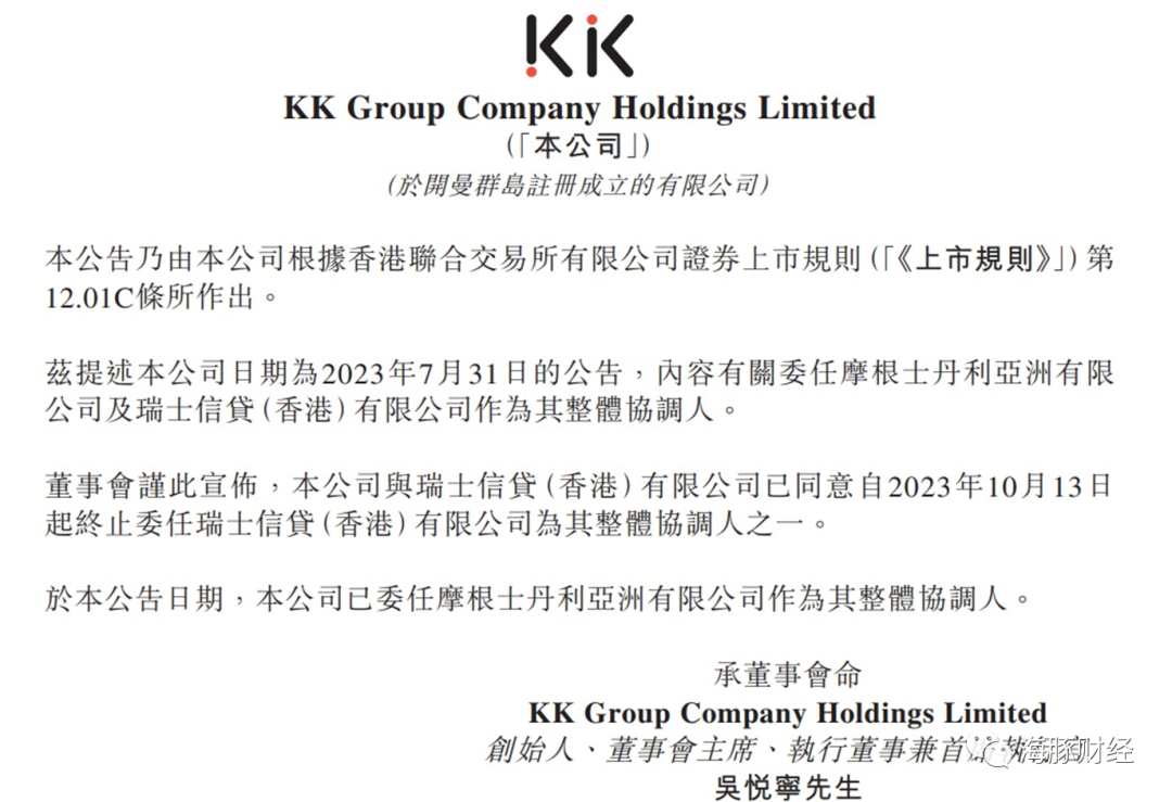 2023年10月15日,KK集团在港交所公告称,公司与瑞士信贷(香港)有限公司已同意自2023年10月13日起终止委任瑞士信贷(香港)有限公司为其整体协调人之一。即日起,KK集团已委任摩根士丹利亚洲有限公司作为其整体协调人。