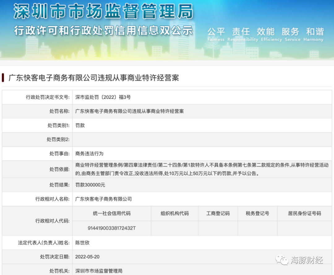 海豚财经注意到,KK集团此前曾因违规招募加盟商被举报,最终深圳市场监管部门给予行政处罚。
