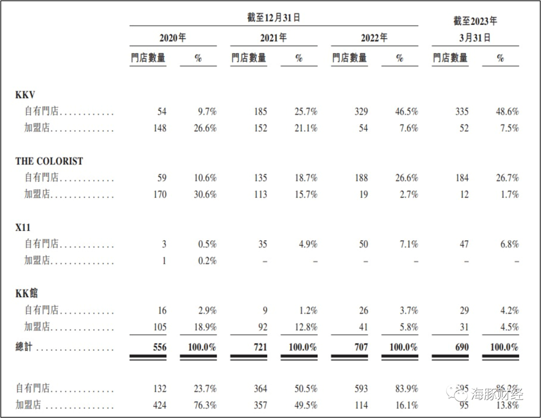 这意味着,从2020年到2023年一季度末,不到三年时间,KK集团的加盟店占比减少64%。