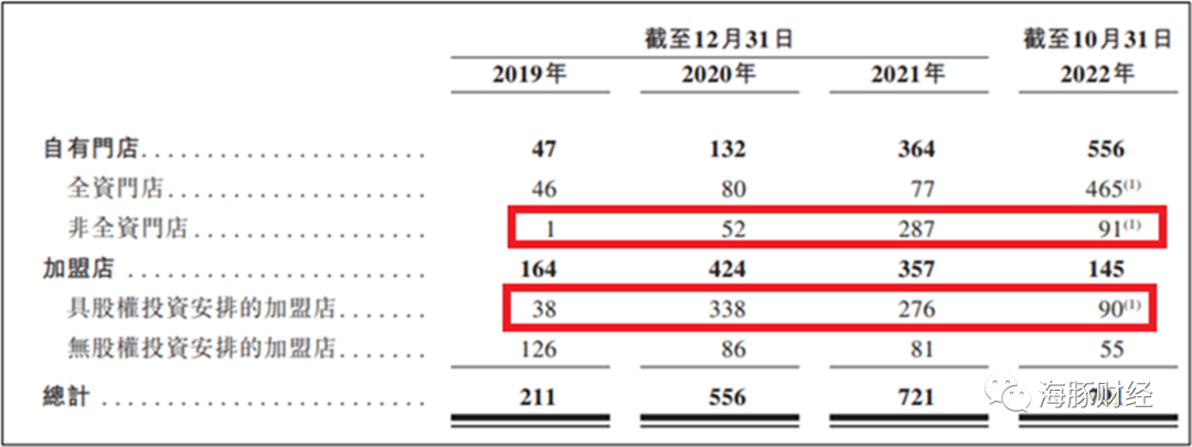 2019年和2020年,KK集团门店总数分别为211家和556家,其中加盟门店分别为164家和424家,自营门店47家和132家,加盟店占比分别为78%、76%。截至2021年末,加盟店和自营店分别为357家和364家,加盟店比例下降至50%。