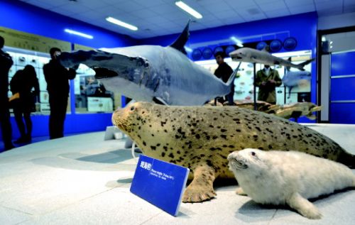 中华鲟、棱皮龟、须鲸、长尾鲨、蓝枪鱼……这些珍稀的海洋动物标本原来你可能只有到水族馆里才能看到,如今在青岛39中新校区的校园里你就能看到了。3月20日,由青岛39中与青岛水族馆共建的“海洋生物科教馆”正式开馆。首批近200件海洋生物标本率先展示,部分还将定期更新,循环展出。作为海洋特色学校,39中的学生今后不用走出校门,就能看到多样性的海洋生物,激发其海洋研究兴趣。