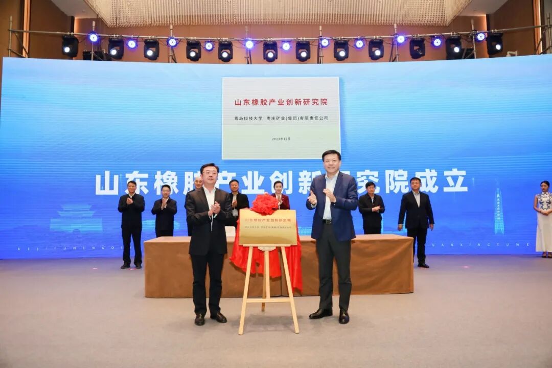 签约仪式上,李兴伟与枣庄矿业(集团)有限责任公司党委书记、董事长侯宇刚为山东橡胶产业创新研究院揭牌。