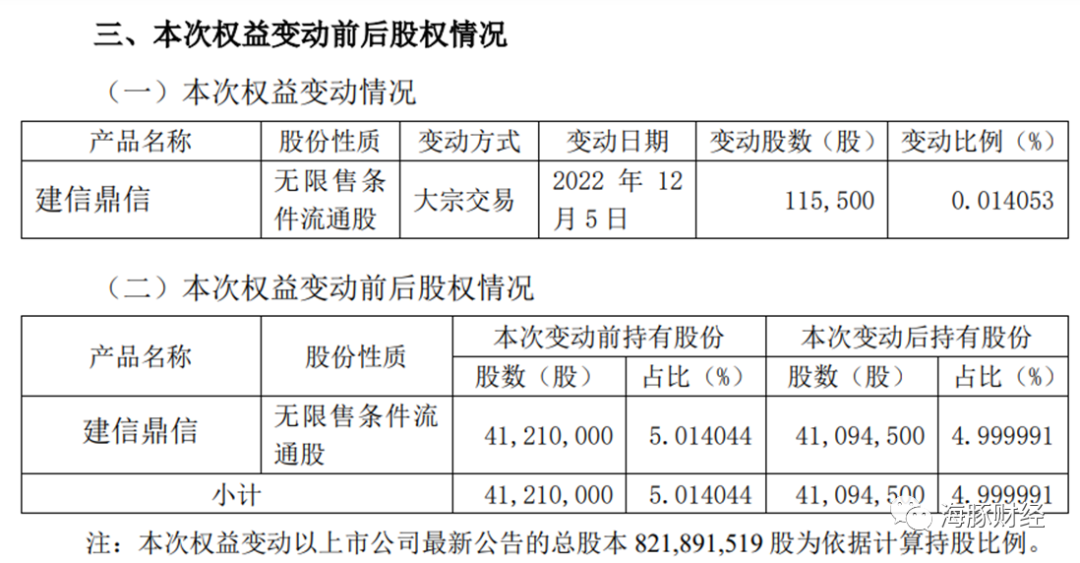值得注意的是,2022年12月5日,顾家家居发布公告称,建信鼎信通过大宗交易减持其持有的顾家家居股115500 股,占公司总股本的 0.014053%。本次交易后,建信鼎信持有公司股份比例由5.014044%减少至4.999991%,不再是公司5.00%以上的大股东。12月5日,顾家家居成交均价约38元。