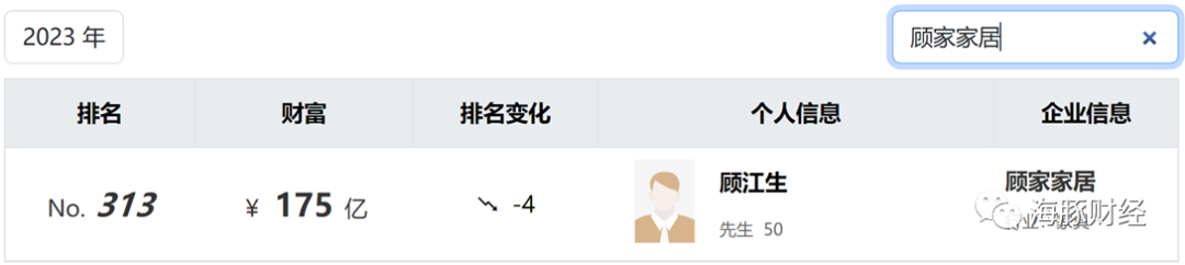海豚财经注意到,顾江生以175亿元财富位列2023年胡润百富榜第313名(注:上榜企业家财富计算的截止日期为2023年9月1日)。