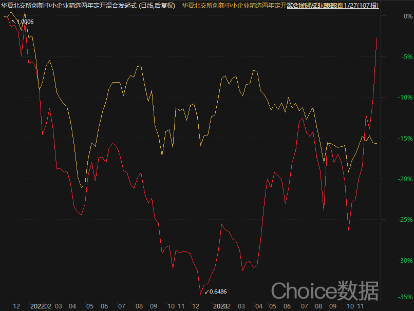 再来看近一周表现最好的汇添富北交所精选A,回报率17.78%。单位净值在10月最低跌到了0.67元,其后也走出了近乎垂直的上涨。