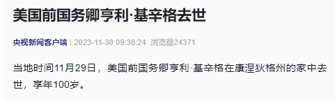 据央视新闻客户端消息,当地时间11月29日,美国前国务卿亨利·基辛格在康涅狄格州的家中去世,享年100岁。