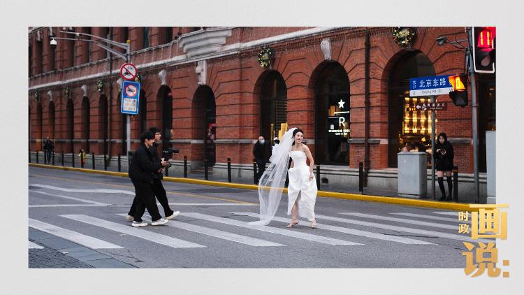 △身着婚纱的新娘穿行于古老的外滩街巷。包容、开放与时尚,是洋溢在这座城市中的别样烟火气息。黄浦区,上海。