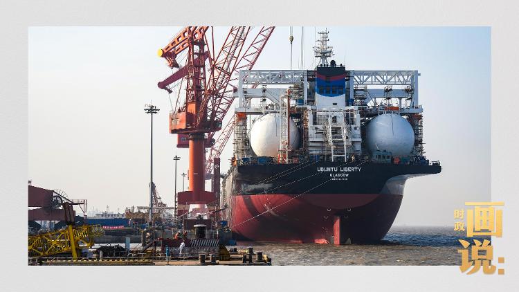 △外高桥船坞码头旁,一艘建造中的巨型双燃料散货船停靠在泊位。浦东新区,上海。