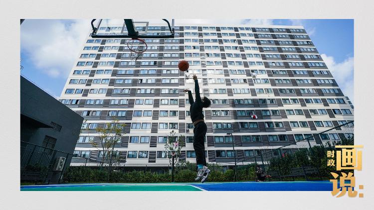 △社区篮球场上练习投篮的小男孩。闵行区新时代城市建设者管理者之家所在的社区是上海市首批大型保障性租赁住房项目之一,为许多来沪新市民、青年人和一线务工人员提供住房保障。闵行区,上海。