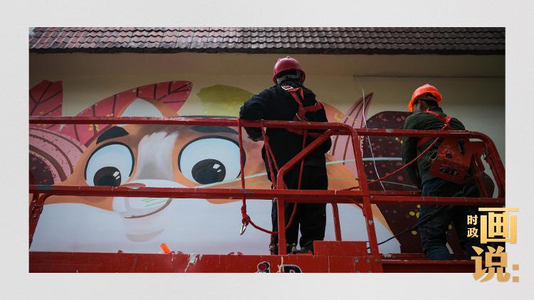 △工人在街道外墙上喷绘画作,一座城市的艺术气息浓缩于街巷的细节里。南昌路,上海。
