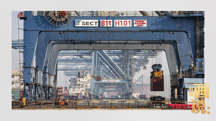 △上港集箱外高桥码头,巨型塔吊正在吊装集装箱货柜。浦东新区,上海。