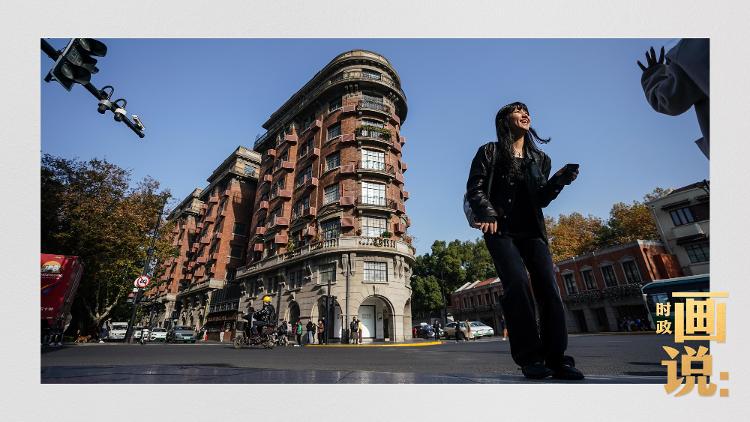△武康大楼前留影的外籍游客兴奋不已。淮海中路,上海。