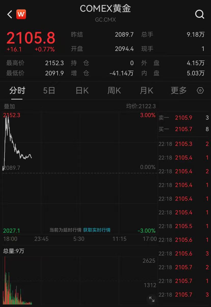 12月4日早盘,现货黄金大幅波动,COMEX黄金期货早盘一度站上2150美元/盎司关口,现货黄金涨至2144美元/盎司,均续历史新高。截至11:30,COMEX黄金期货涨幅回落至0.77%,暂报2105.8美元/盎司,一度涨至2152.3美元/盎司。