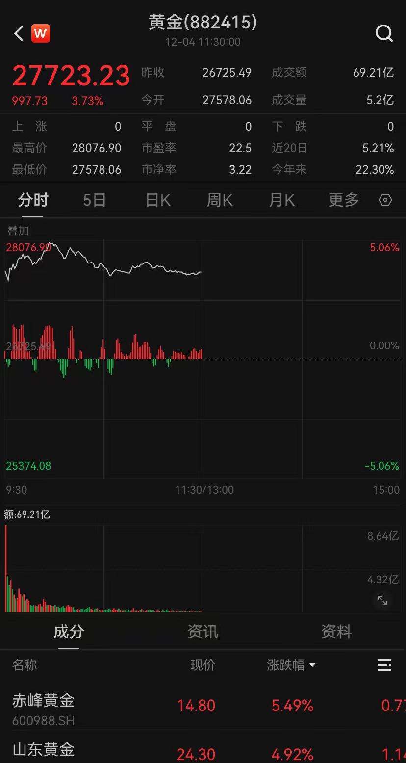 受此影响,今日开盘A股黄金股大涨,涨幅一度超过5%,午盘回落至3.73%。个股方面,赤峰黄金(600988.SH)上涨5.49%,山东黄金(600547.SH)、玉龙股份(601028.SH)、四川黄金(001337.SZ)涨超4.8%。