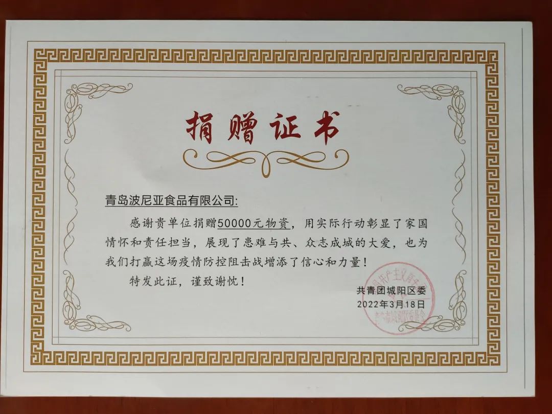 民以食为天,作为食品企业,波尼亚公司秉持高度的社会责任感和使命感,坚持“食品工业是道德工业”。努力实践和发扬“发展企业、回馈社会”的光彩精神,在做大做强的同时,积极投身公益慈善,履行社会责任,通过捐资助学、慈善捐款、助力乡村振兴、一司一县对口扶贫、驰援抗击新冠疫情等方式,以高度的社会责任感践行着企业的使命与担当,近年来为公益事业共捐款人民币500余万元。