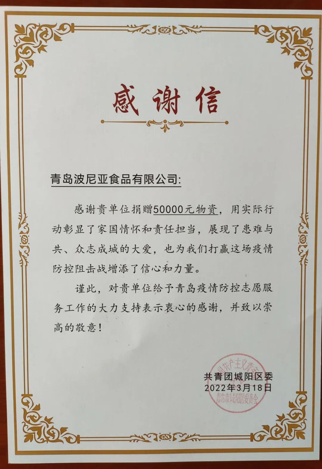 疫情就是命令,人人皆为防线。面对新一轮疫情来袭,波尼亚公司始终发挥模范带动作用,积极响应党和国家号召,支持各级公益组织工作,尽企业之力伸出援手,以实际行动汇聚众志成城、携手抗击疫情的磅礴力量。