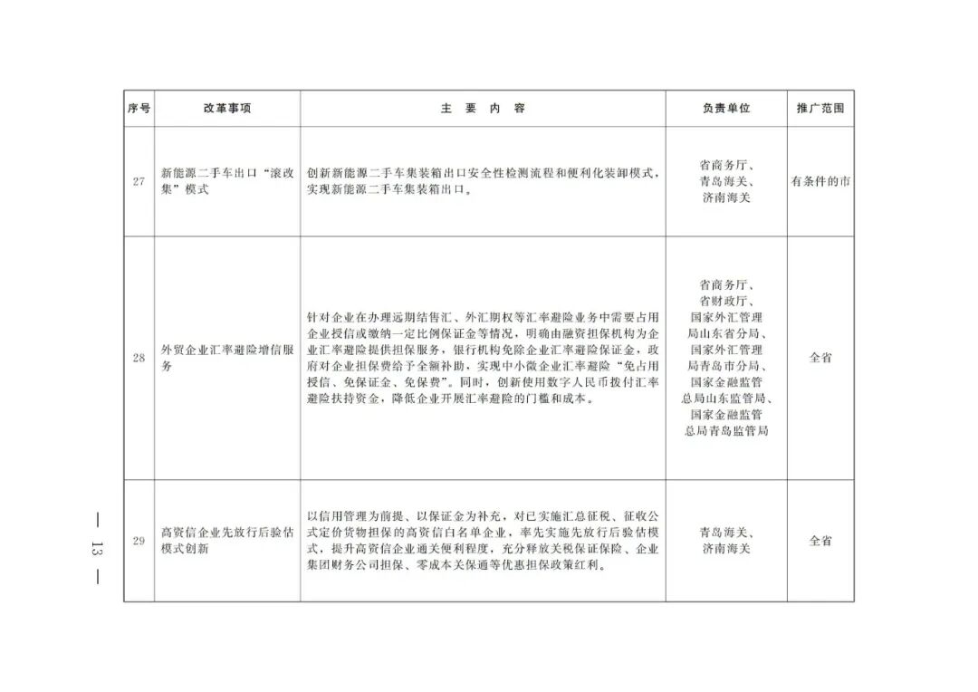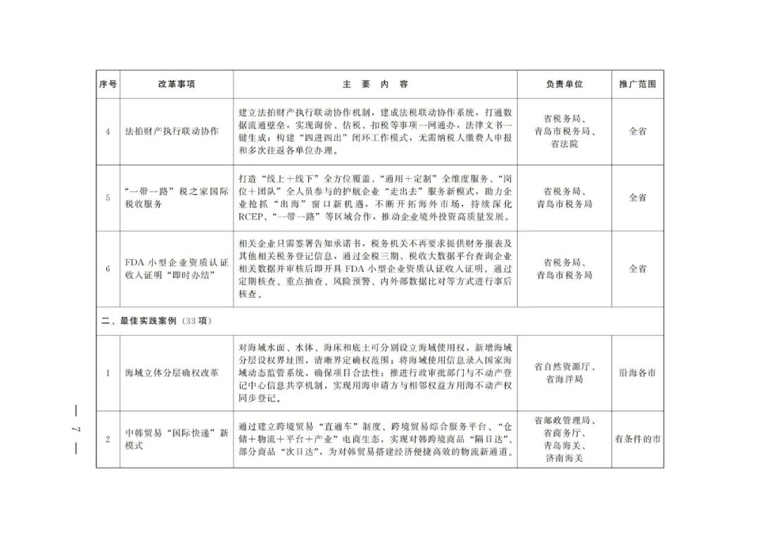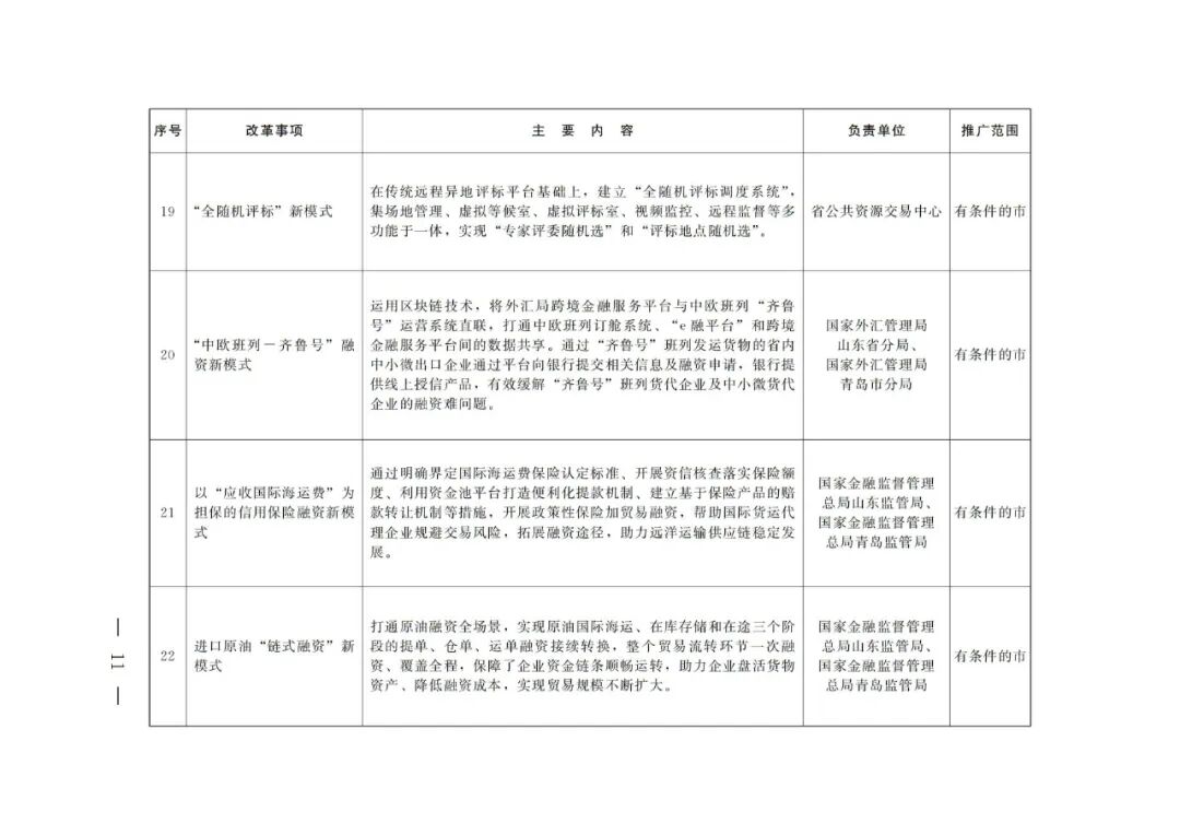 7.金融开放创新领域(5项):“中欧班列-齐鲁号”融资新模式、以“应收国际海运费”为担保的信用保险融资新模式、进口原油“链式融资”新模式、气候投融资机制创新、铁路运输单证融资新路径。