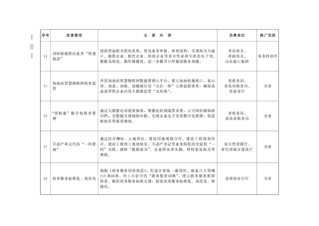 6.政府管理创新领域(8项):国际海事司法标准供给、公共资源交易全流程“一照通投”、国际船舶供应业务“快速通道”、加油站智慧物联网税务监管、“票税通”数字化税务管理、不动产单元代码“一码管地”,政务服务标准化、规范化,“全随机评标”新模式。