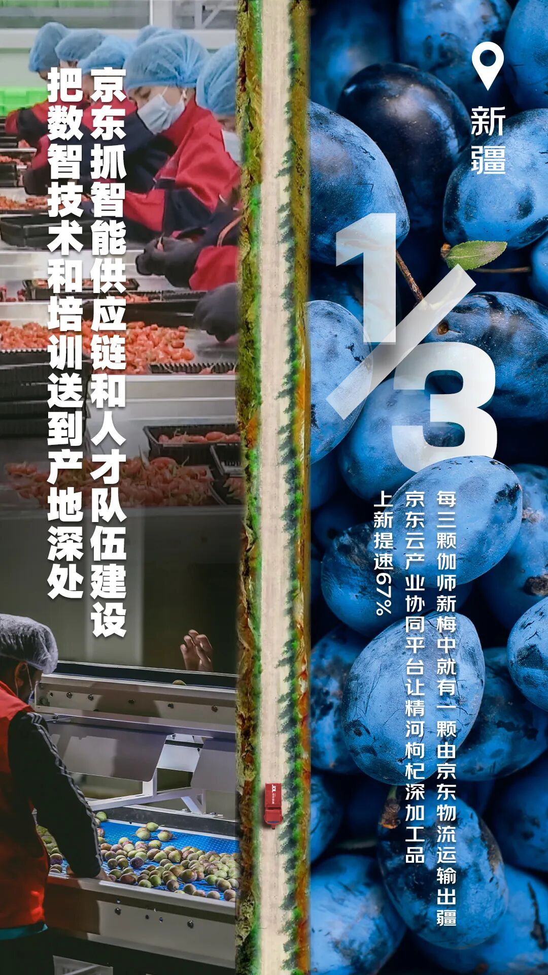 京东物流在新疆伽师、陕西武功的两座产地智能供应链中心联动,让伽师新梅最快48小时就能送到全国消费者手中,运输成本降低20%左右,今年直接带动伽师当地新梅产业增收超过10亿元,果农人均收入超过12000元。如今,每三颗伽师新梅中,就有一颗是由京东物流运输出疆的。