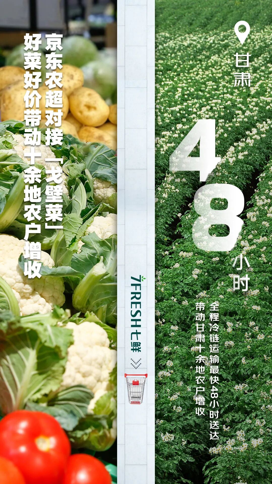 京东旗下七鲜超市整合当地农户散种资源,打造农超对接,甘肃天水、张掖、武威等地戈壁滩上的蔬菜,全程冷链运输最快48小时送达消费者餐桌,好菜卖上好价,带动甘肃十余地农户增收。