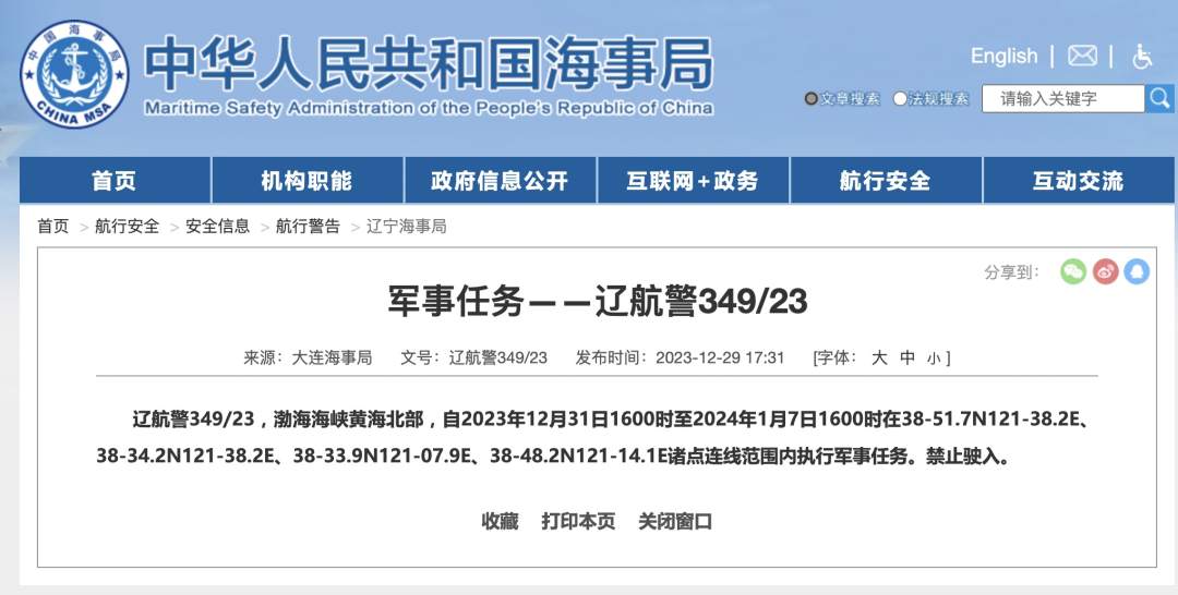 航行警告:渤海海峡黄海北部部分海域执行军事任务,禁止驶入 2024-01-01 10:43 0 据中国海事局网站消息,大连海事局发布航行警告,自2023年12月31日16时至2024年1月7日16时,渤海海峡黄海北部部分海域执行军事任务,禁止驶入。 来源:中国海事局网站 责任编辑:李赛男