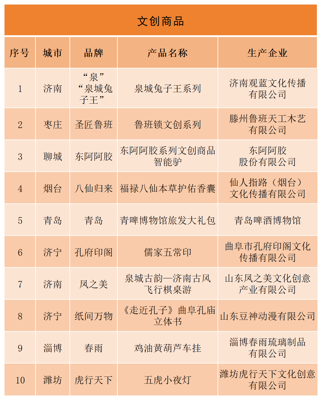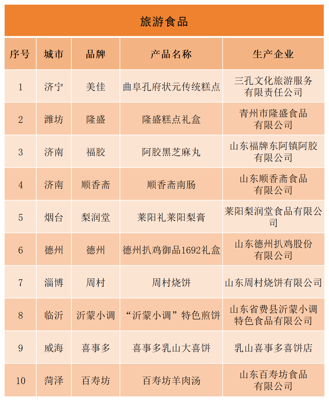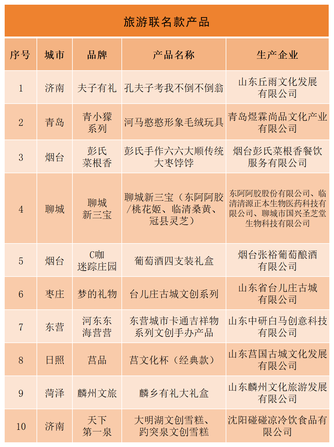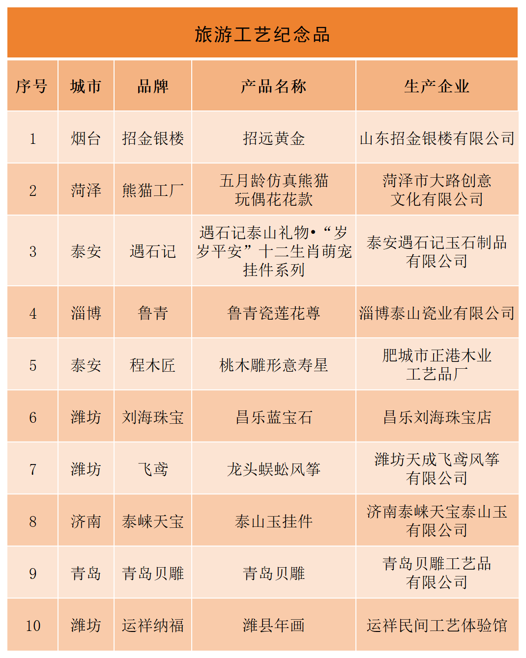 为落实《进一步促进文化和旅游消费的若干措施》,山东省文化和旅游厅开展“‘好客山东 好品山东’旅游必购品TOP10评选活动”。经过各市推荐、专家初评、网络投票、专家终评、社会公示等程序,确定“旅游食品”、“旅游饮品”、“农特产品”、“旅游工艺纪念品”、“文创商品”、“旅游装备”、“生活用品”、“旅游联名款产品”等8个类别80款产品入选。