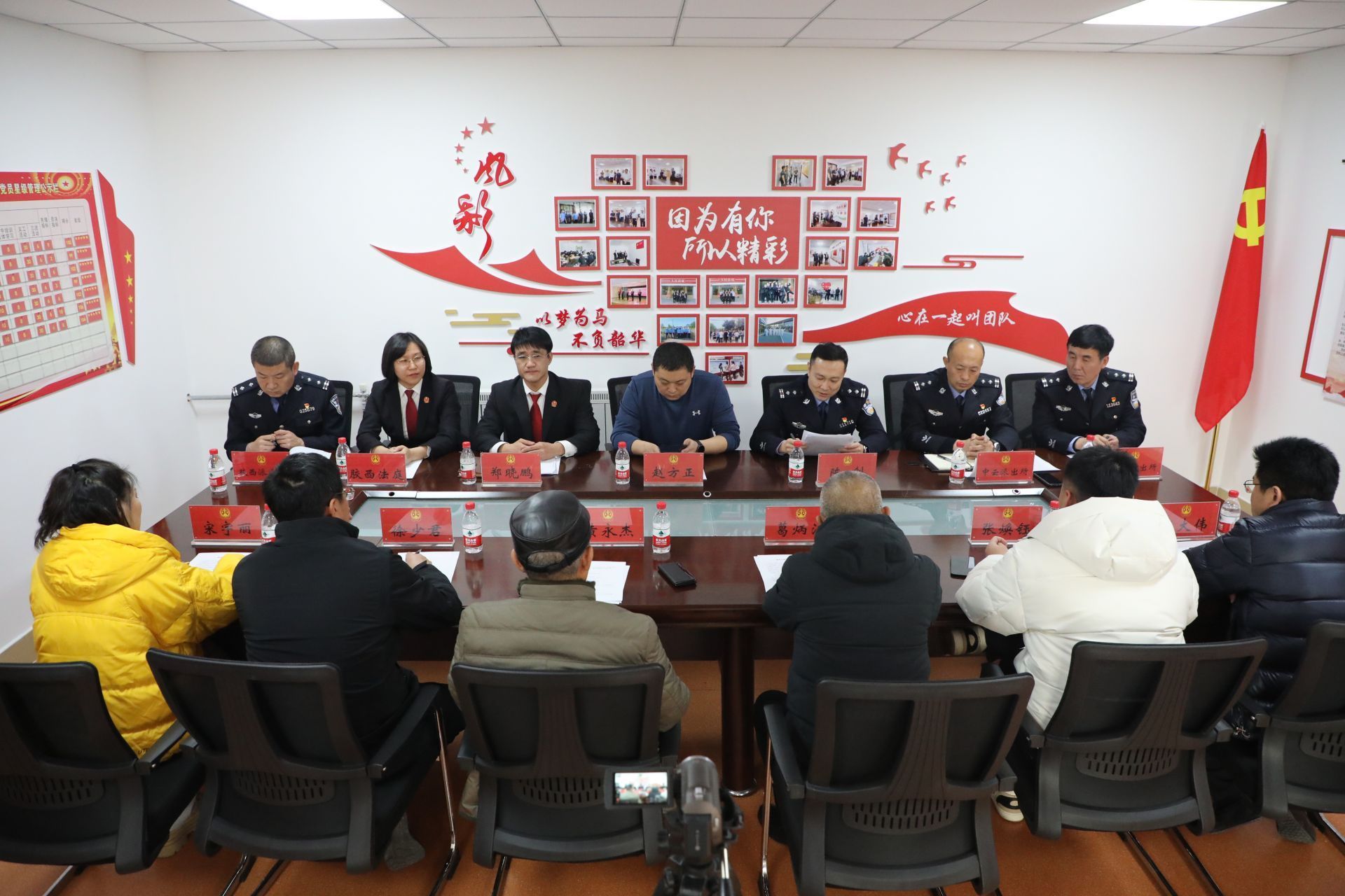 当天,胶西法庭负责人与胶州市公安局中云派出所、胶西派出所、杜村派出所负责人就合作机制进行签约,协议计划在胶西法庭设置驻庭警务工作站,通过共建、整合、优化人民法庭与派出所的人力、智力、科技等资源,紧紧围绕党建平台共建机制、社会风险研判分析、矛盾纠纷联动化解、信息通报共享机制、日常工作互通优势、法治宣传协调配合等方面开展多领域深度合作,实现人民法庭与派出所全方位对接,形成社会矛盾纠纷有效化解和创新社会综合治理工作合力。