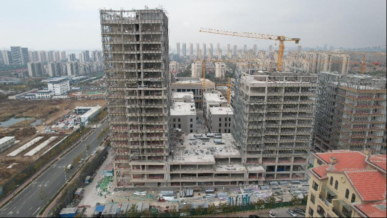目前项目主体结构及人防主体验收已完成,处于室内外装饰装修及机电设备安装阶段,厂房外墙保温收尾、涂料展开大面施工、办公楼幕墙龙骨基本完成,门窗玻璃及机电设备陆续进场安装。