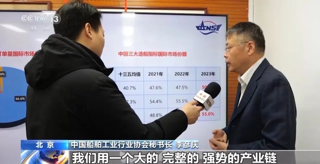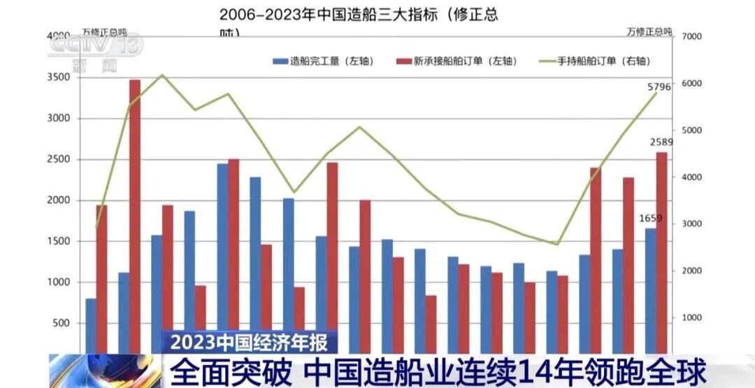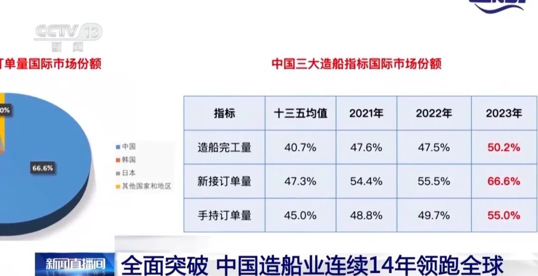 总台央视记者 吴天白:在2023年中国造船业统计数据中,可以看到三大指标占国际市场份额分别是50.2%、66.6%和55.0%,首次全部超过50%。