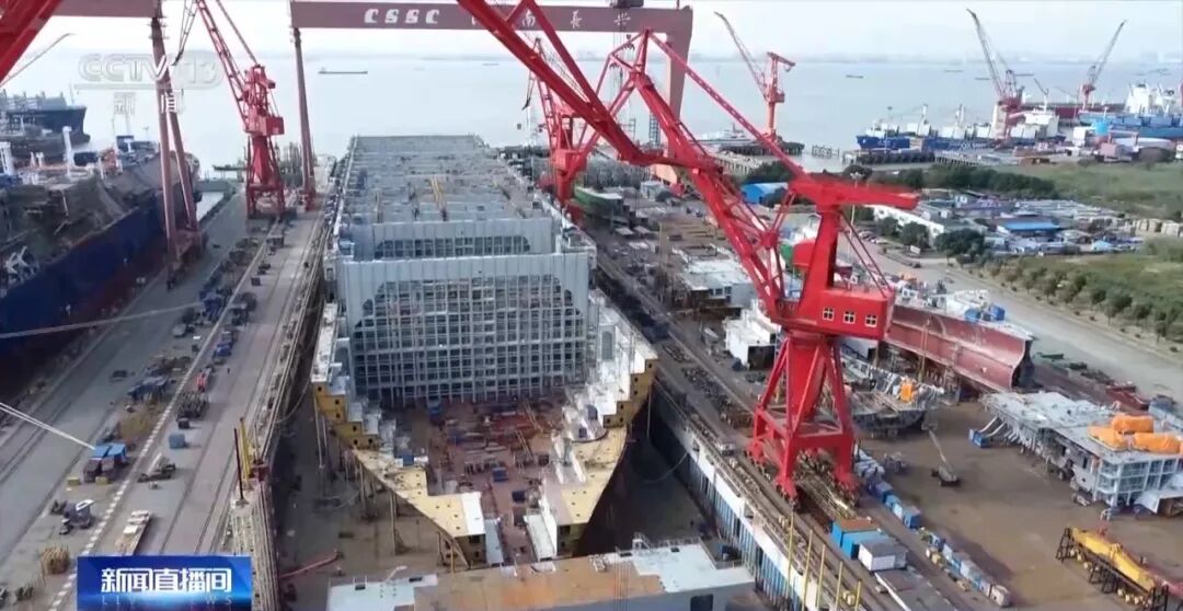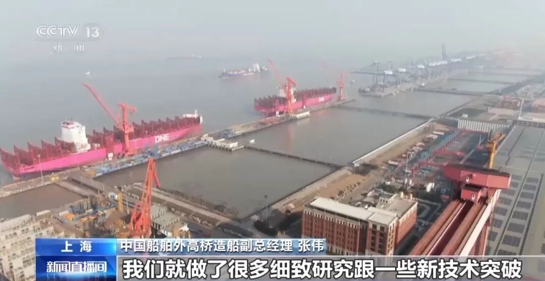中国船舶外高桥造船副总经理 张伟:我们做了很多细致的研究跟一些新技术的突破。现在基本上实现了船体建造、舾装、涂装、一体化的状态,能够缩短我们整个船坞建造周期,以及码头建造周期。