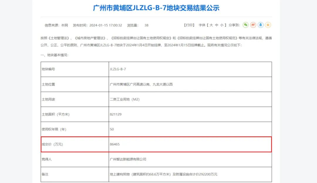 1月16日,广州黄埔JLZLG-B-7地块交易结果公示,由广州智达新能源摘得,成交价8.65亿元。