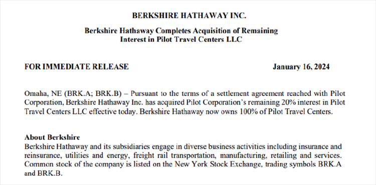 此前,伯克希尔-哈撒韦曾于2017年耗资约27.6亿美元收购Pilot38.6%的股权,并于2023年1月耗资约82亿美元收购Pilot41.4%的股权。有分析称,最新的收购意味着Pilot旅游中心正式被纳入伯克希尔-哈撒韦旗下,成为其全资子公司,这进一步扩展了伯克希尔-哈撒韦在旅游服务领域的业务版图。