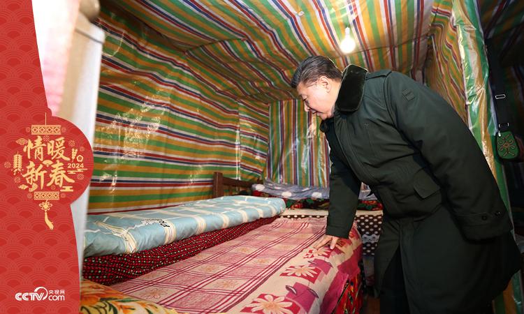 在贫困户吉好也求家的土坯房里,总书记弯下腰,关切地掀开床褥、摸摸被子,看看够不够厚实。