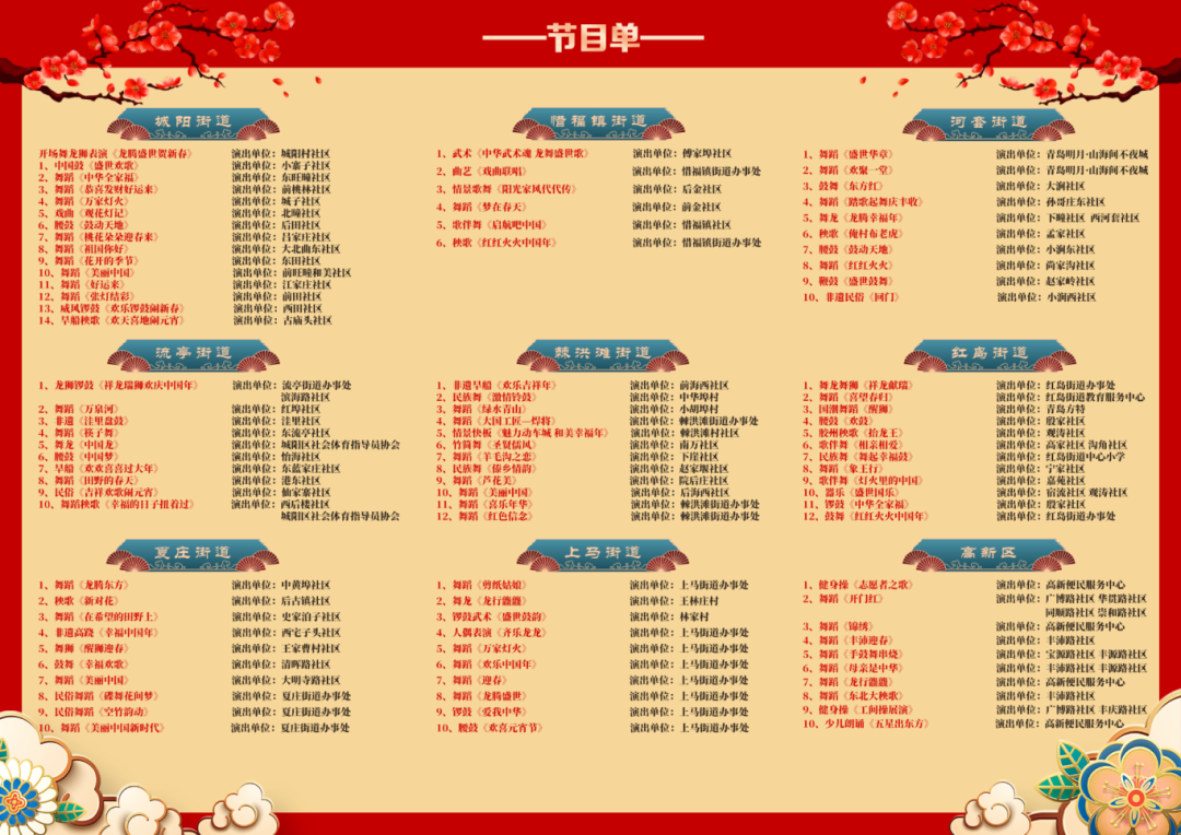 届时,来自全区各街道的100余支社区文化队伍、4000余群众演员将齐聚一堂,将在正阳中路一字排开进行展示,带来旱船、秧歌、舞龙舞狮等百余个民间民俗节目,以及盘鼓、剪纸、高跷等非遗类表演,为全区市民送上异彩纷呈的文化盛宴。