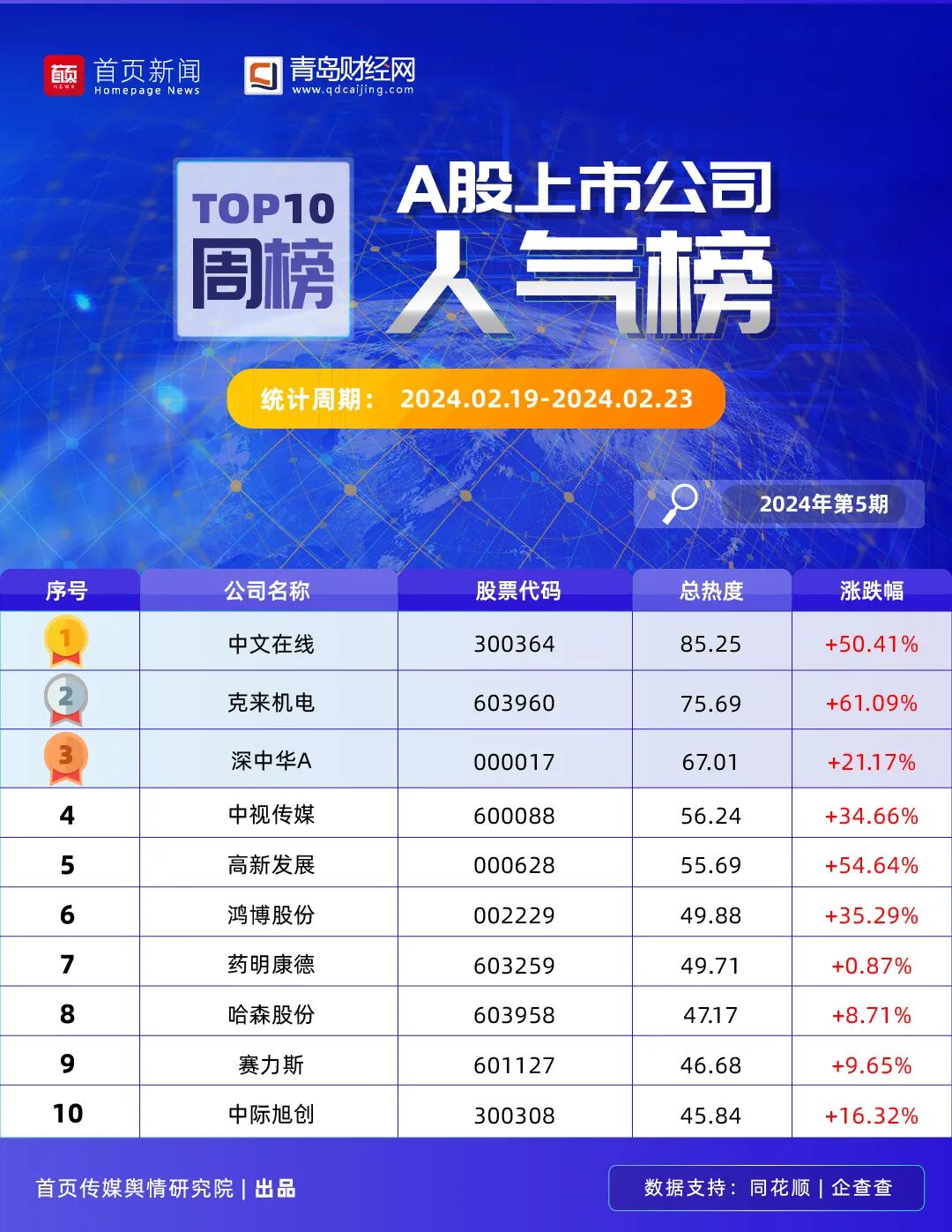 A股上市公司一周人气榜|中文在线高居榜首、会畅通讯人气飙升