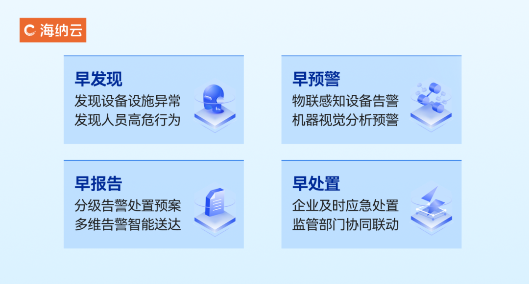 海纳云构建软硬一体的“工贸行业安全监测预警体系”,针对各类隐患类型,对人、物、环境进行监测、预警、处置,对生产设施和监管设备进行实时监测,确保监控设备设施的完好率;做到问题早发现、早预警、早报告、早处置,做到不出事故、少出事故,形成“无危则安,无损则全”的“安全”状态。