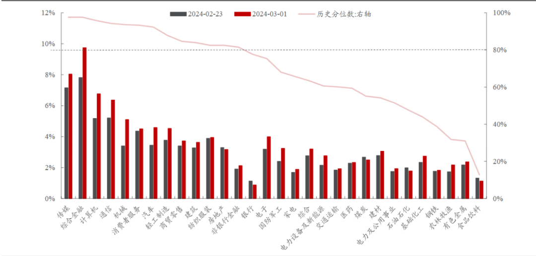 根据民生证券监测数据,最近一个交易周(20240226-20240301)内,市场整体交易热度再度上升,传媒、计算机、通信、机械等板块的交易热度,已经历史最高的50%分位。