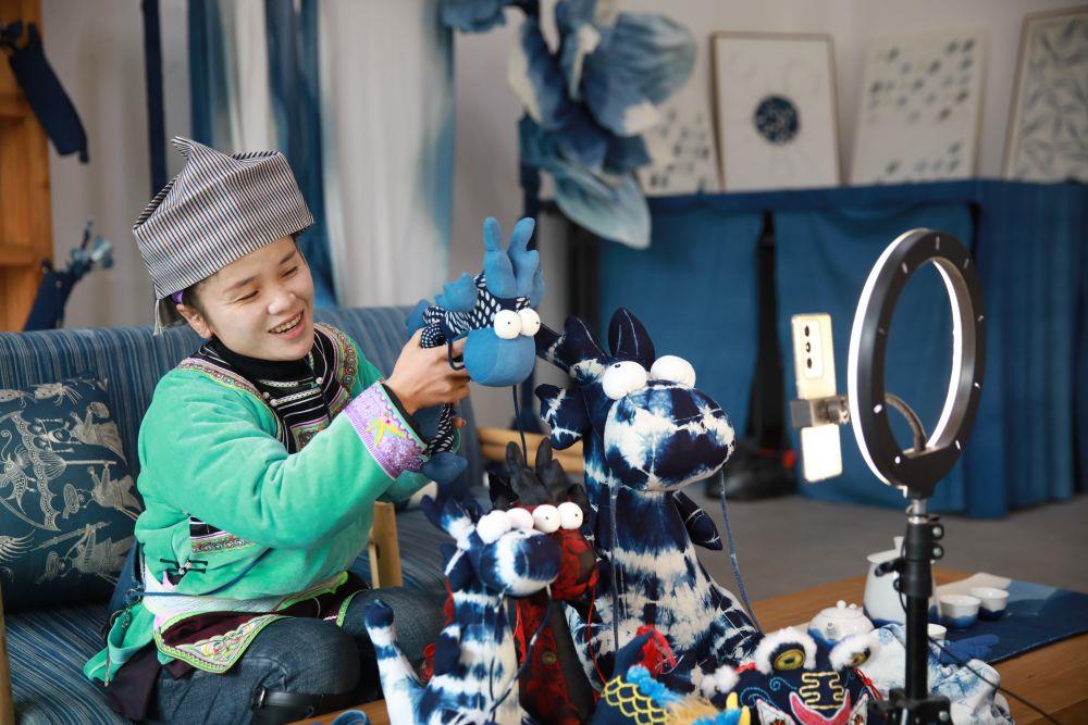 △2024年1月30日,贵州黔东南州榕江县青于蓝蓝染艺术中心内,绣娘在直播带货。