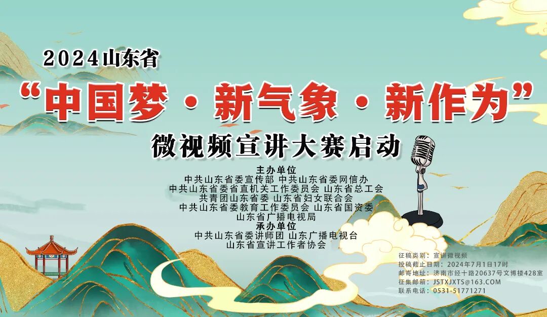 为深入学习宣传贯彻习近平新时代中国特色社会主义思想,广泛深入推进“群众讲给群众听”宣讲活动开展,全面展现广大干部群众在新时代新征程上的新气象新作为,在全省开展“中国梦·新气象·新作为”微视频宣讲大赛,面向社会公开征集优秀微视频宣讲作品。本次大赛由山东省委宣传部、省委网信办、省委省直机关工委、省总工会、团省委、省妇联、省委教育工委、省国资委、省广电局主办,省委讲师团、山东广播电视台、省宣讲工作者协会承办。