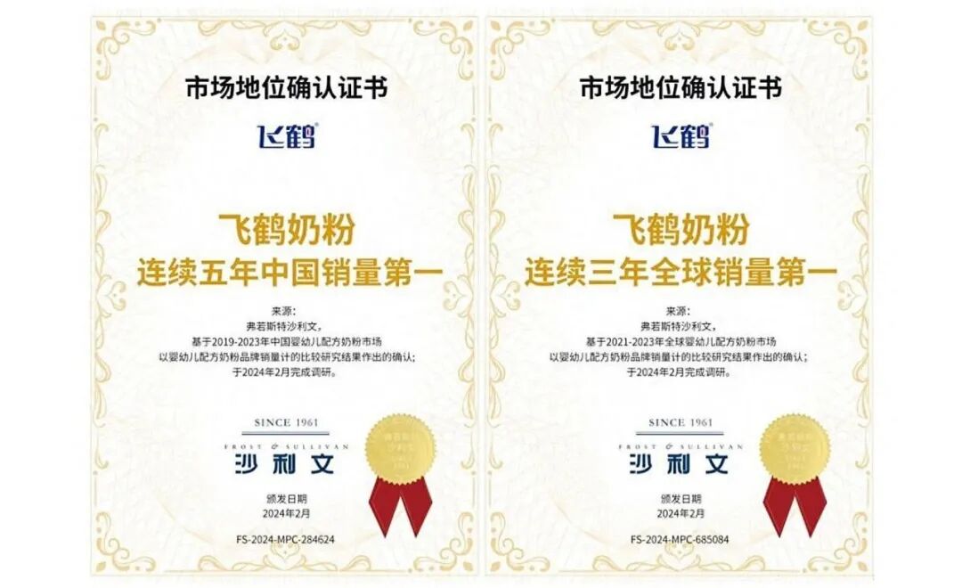 据调研公司弗若斯特沙利文最新披露,2019—2023年,中国婴配奶粉市场,飞鹤连续5年位居第一;在全球婴配奶粉市场,连续3年销量第一。