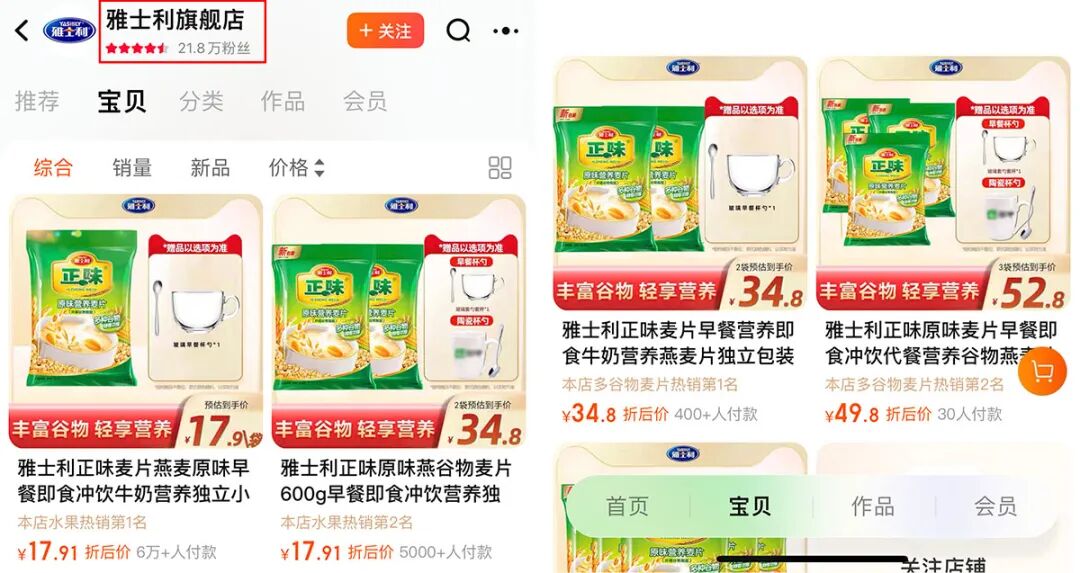 目前,雅士利天猫旗舰店粉丝21.8万,店内仅销售正味牌“原味营养麦片”,奶粉产品皆已下架。