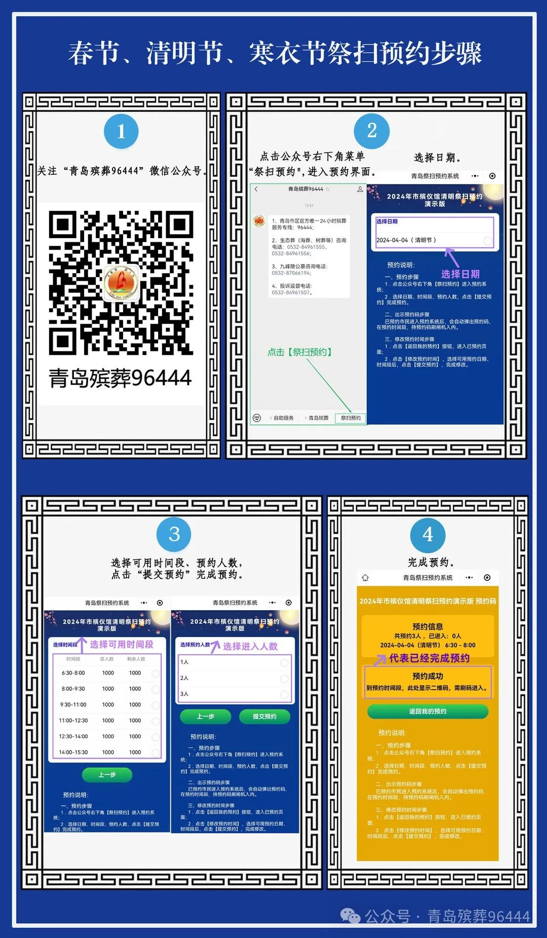4月4日清明节当天,到市殡仪馆现场祭扫的群众需提前预约,预约通道现已开通,预约方式为:关注“青岛殡葬96444”微信公众号-点击右下方“祭扫预约”-选择祭扫时间、人数-提交预约,预约成功后请严格按照预约时间刷码进入。若预约多人祭扫的(每部手机最多预约3人),需同行人员一同入内。