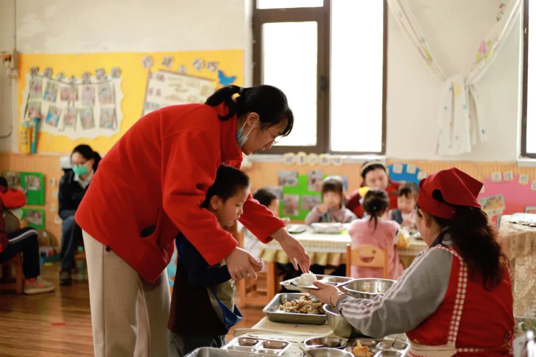 市北区幸福之家融合幼儿园里,孩子们坐在一起用餐