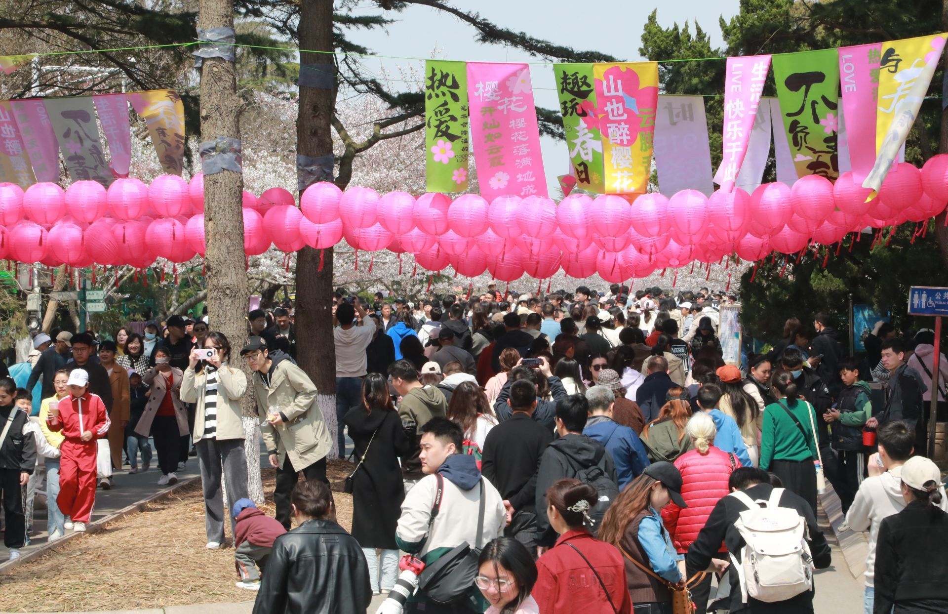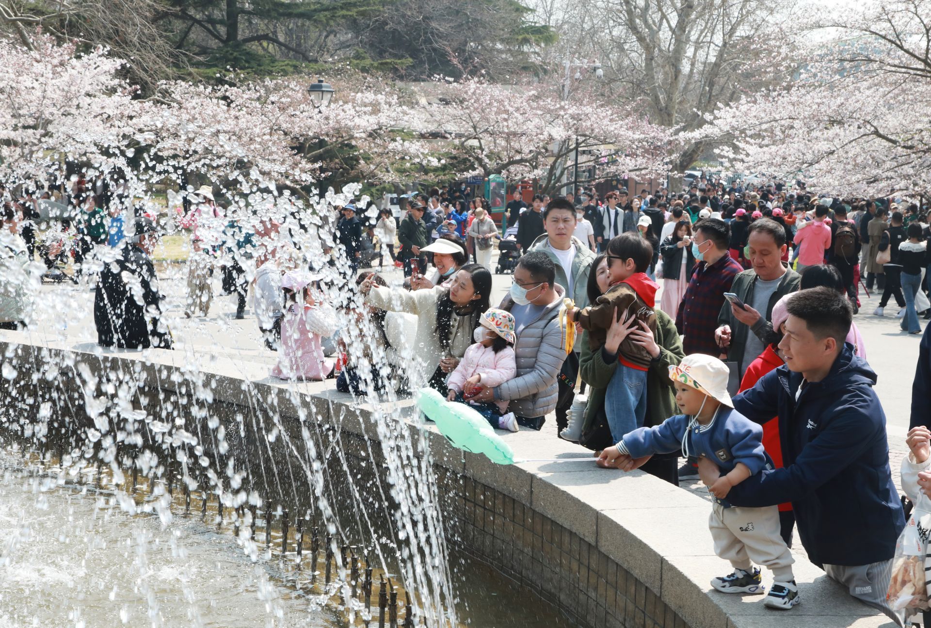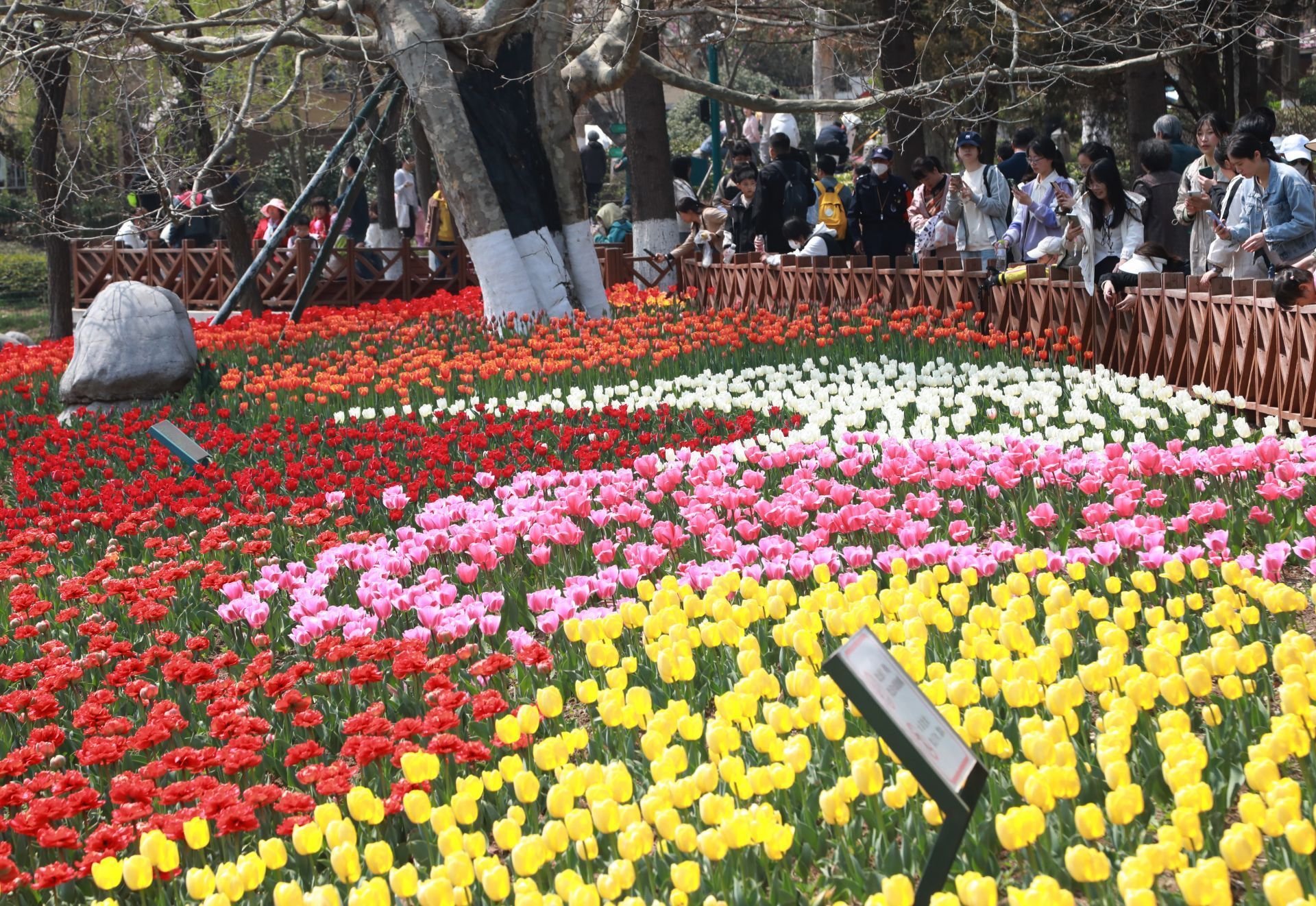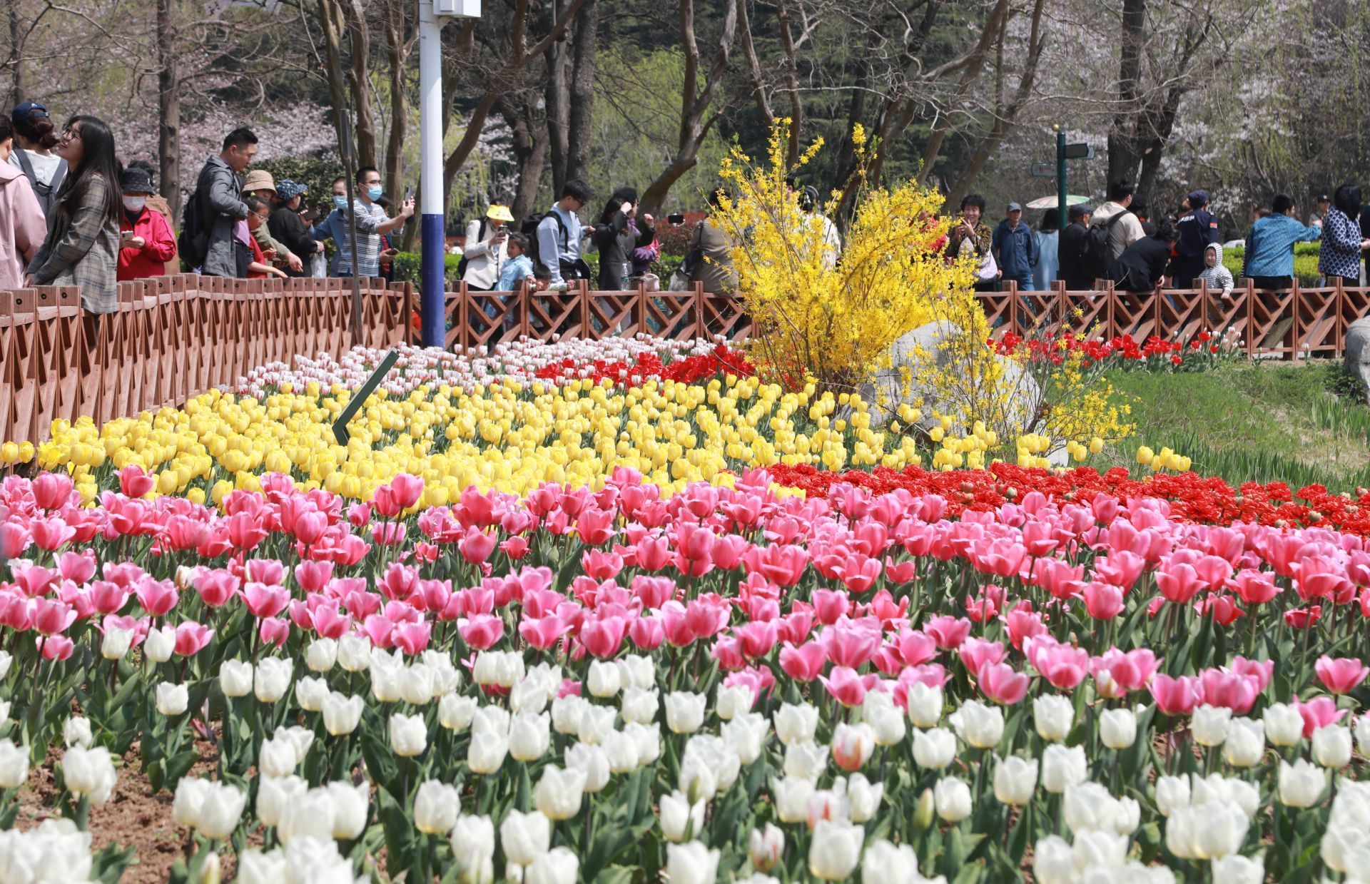4月6日,中山公园内的“2024青岛樱花节”吸引了众多游客。目前,单樱迎来了盛花期,公园笼罩在一片粉色花海中。小西湖附近的郁金香成片绽放,有红、粉、黄、白等多种颜色,游客徜徉花海,踏青赏花,打卡留念。